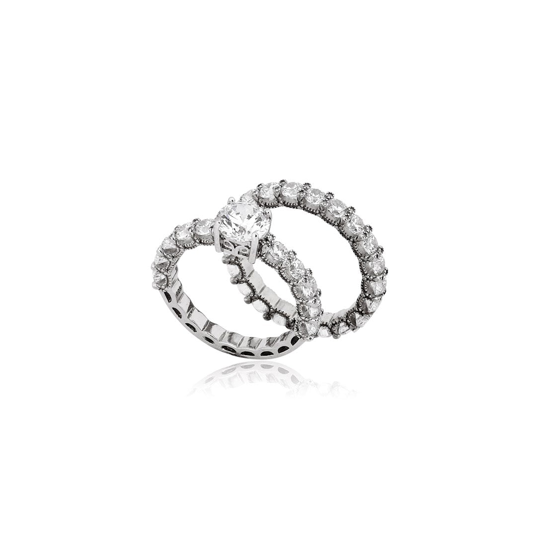 Aliança Solitário em prata 925 com aparador, cravado com zircônias redonda Solitário 7mm e aparador com zircônias de 3mm e acabamento em banho de ródio.