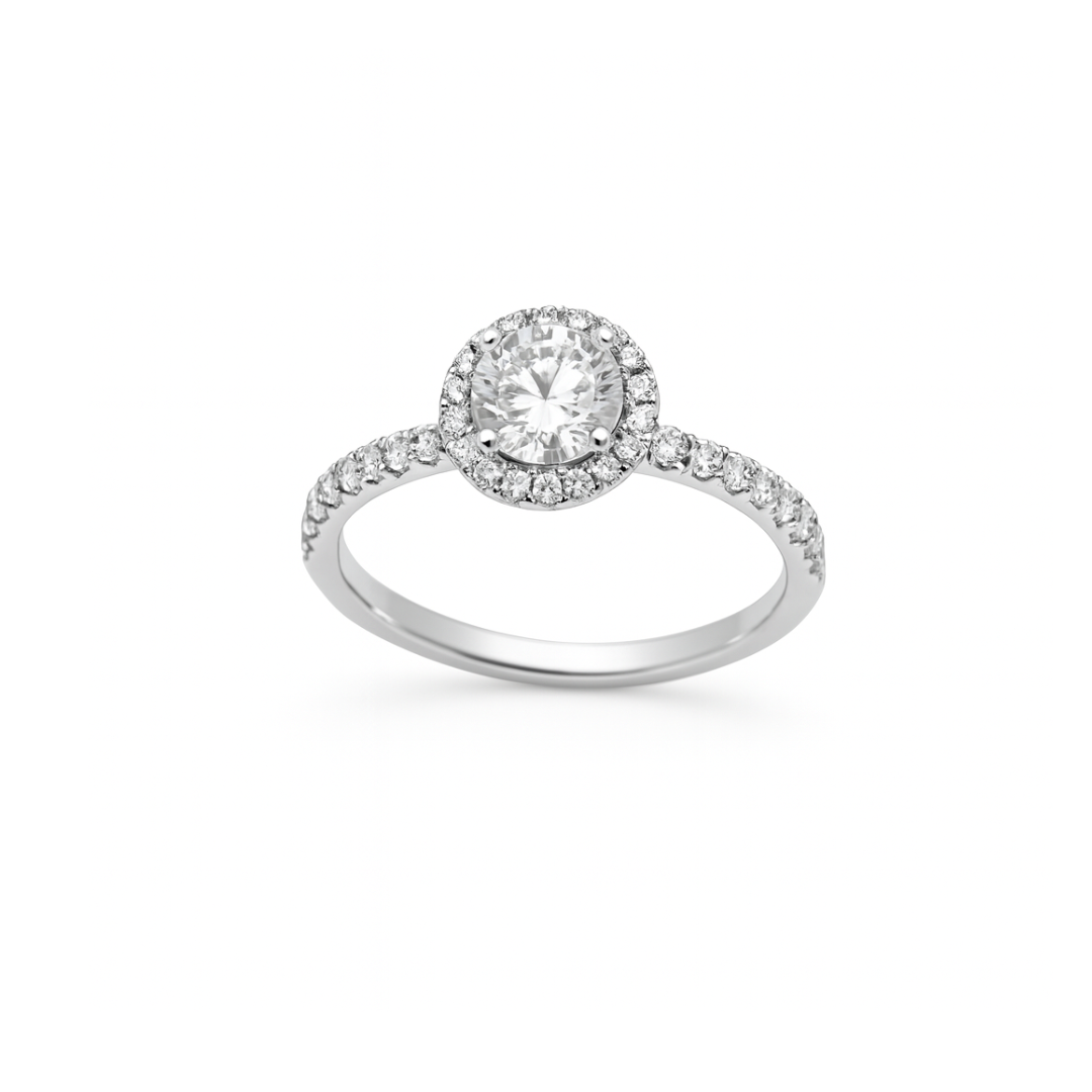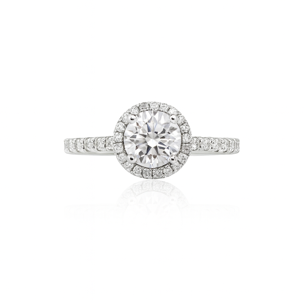Anel em prata 925, cravado com 1,00ct de moissanita central redonda, volta e aro cravados e acabamento em banho de ródio.