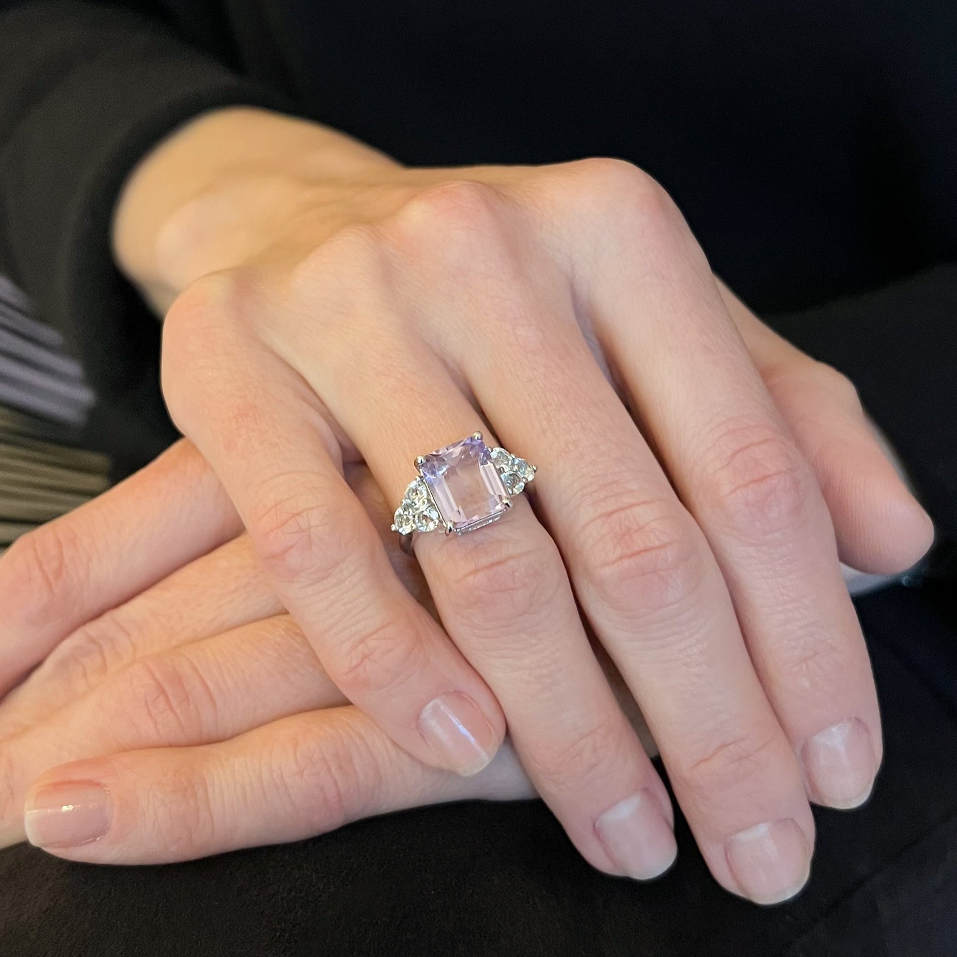 Anel todo feito a mão em prata 950, cravado com 4,60ct ametista rosa, 1,25ct topázio incolor e acabamento em banho de ródio.