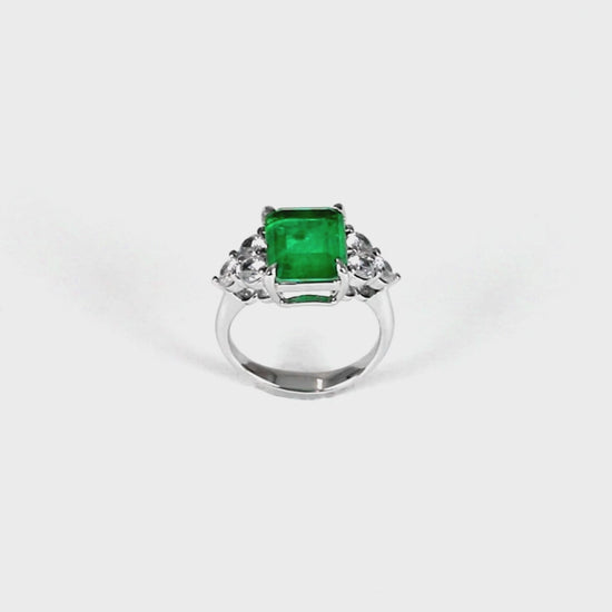 Anel produzido à mão em prata 950, cravado com esmeralda fusion oval 9x11, zircônia gotas 3x5 e redonda de 3,5mm e acabamento em banho ródio.