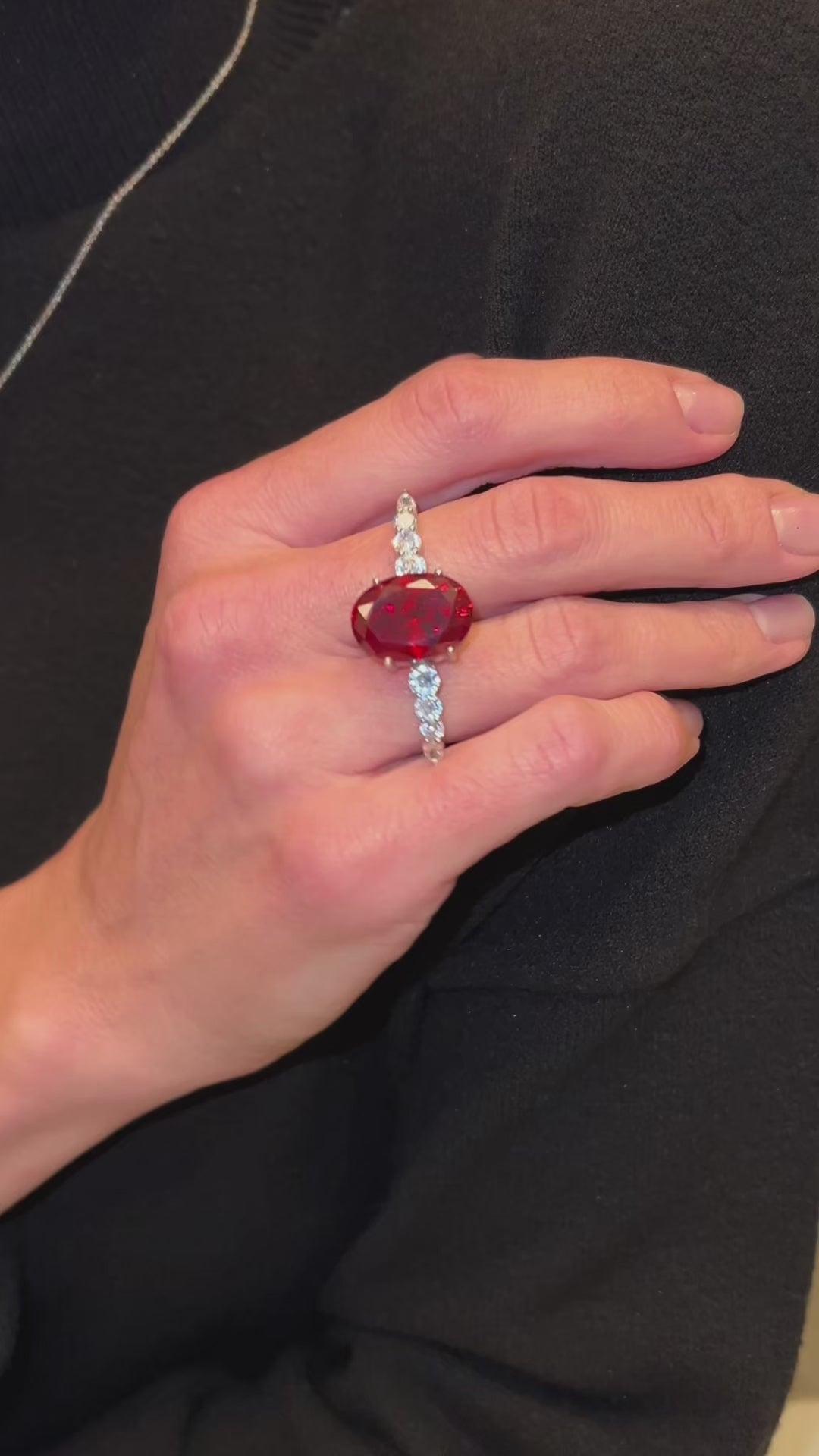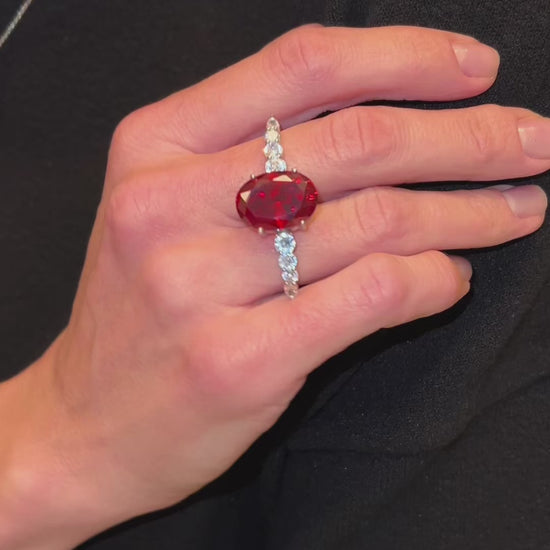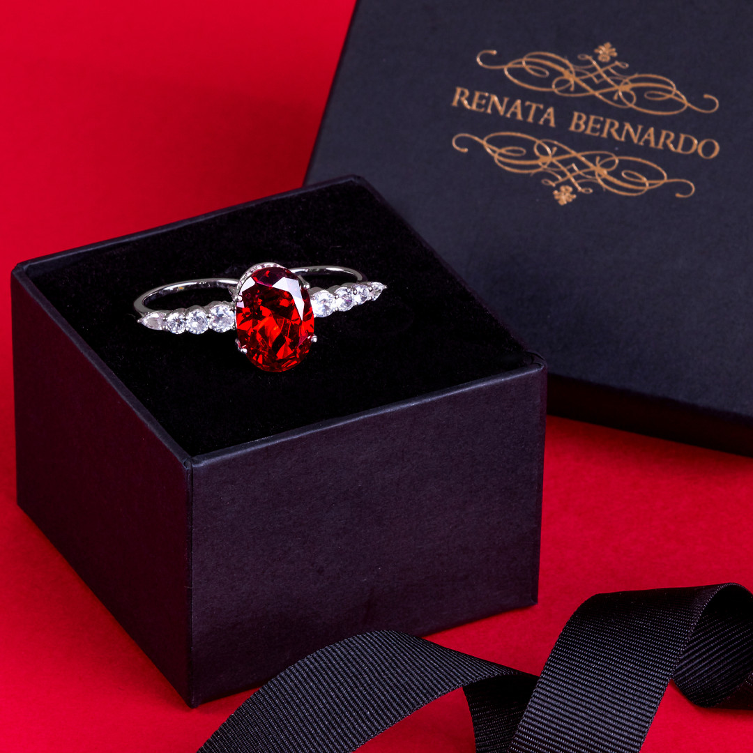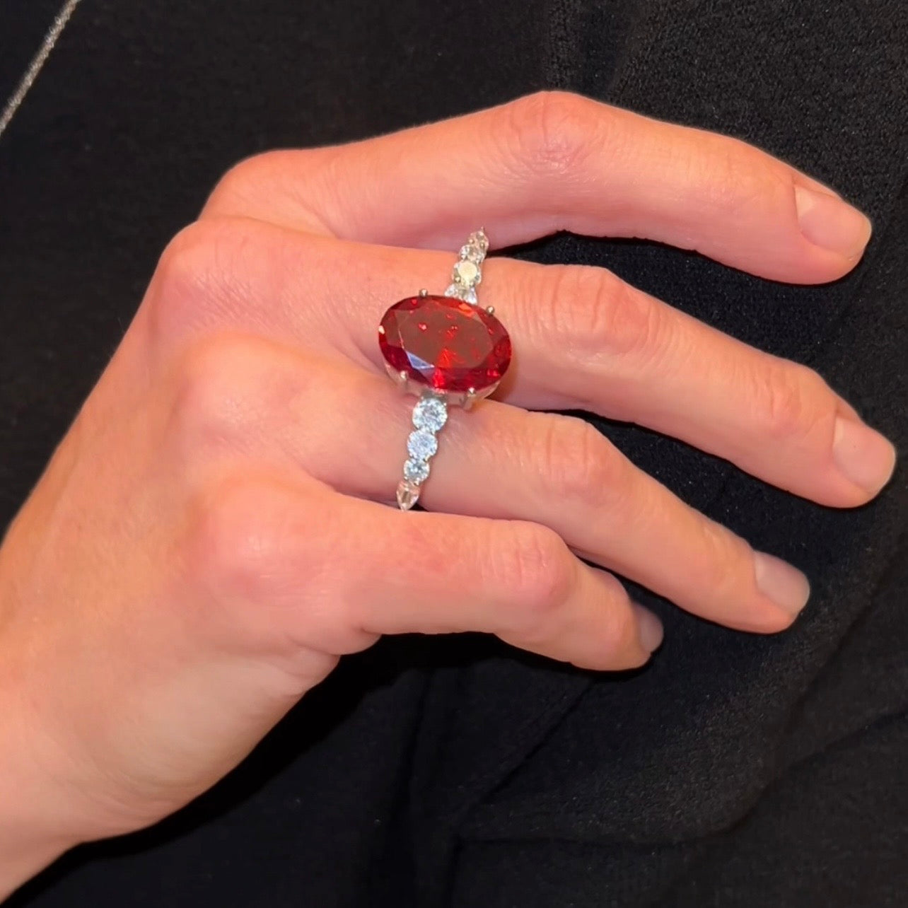 Anel todo produzido à mão em prata 950, granada fusion oval e zircônias com acabamento em banho de ródio.
