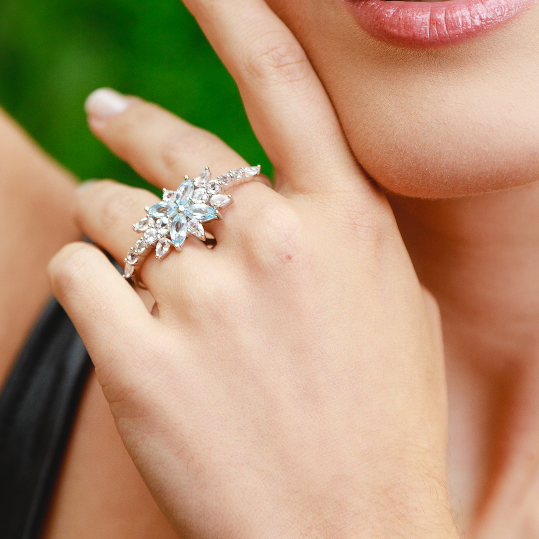 Anel todo produzido à mão em Prata 950, cravado com topázio azul e incolores e acabamento em banho de ródio.