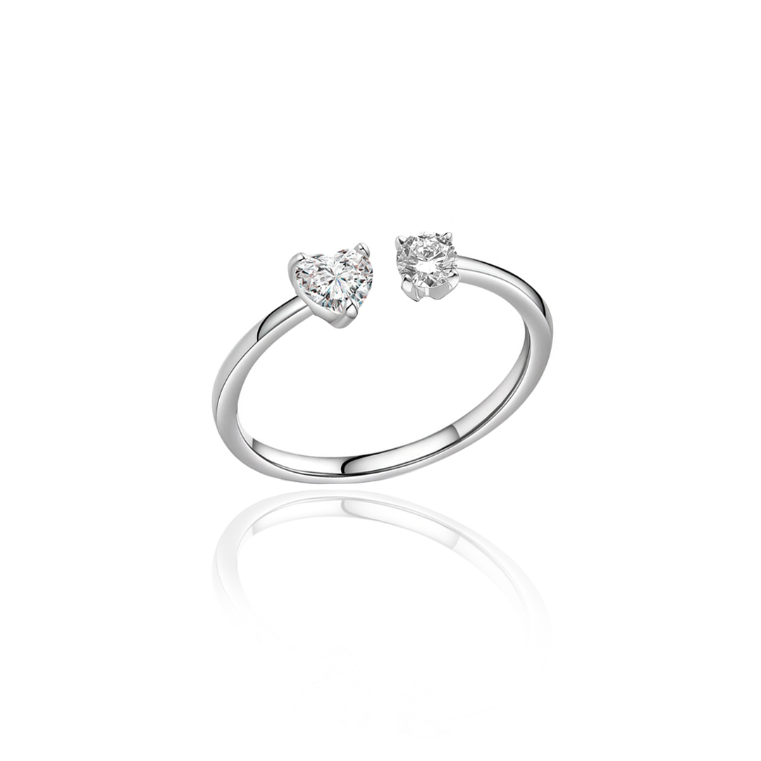 Anel em prata 925, cravado com coração e redonda de moissanita e banho de ródio.