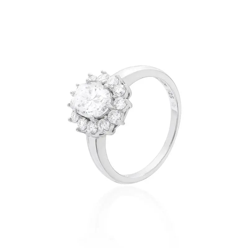 Anel em prata 925, cravado com moissanita oval 6x8 e moldura com acabamento em banho de ródio.