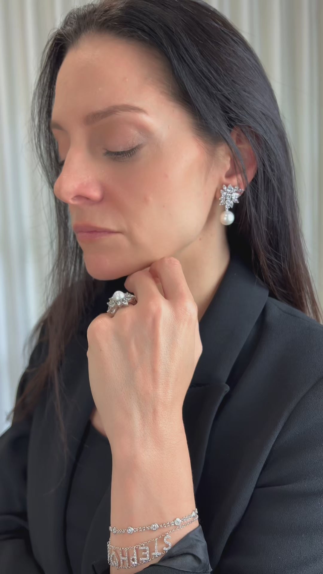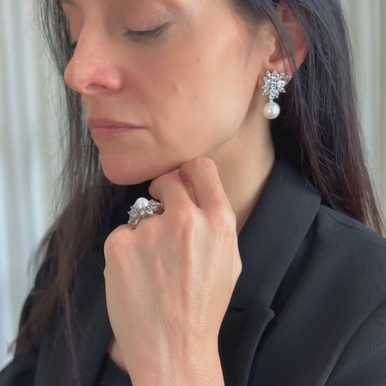Brinco feito à mão em prata 950, composição de gotas, navetes e redondas de zircônia e pérola freshwater natural.