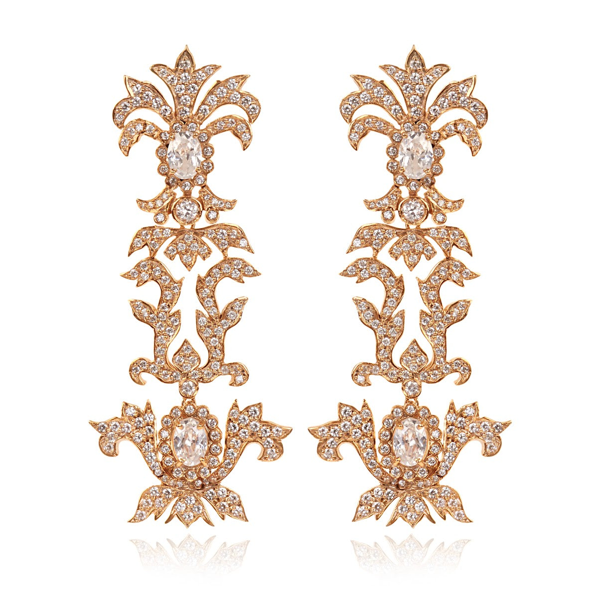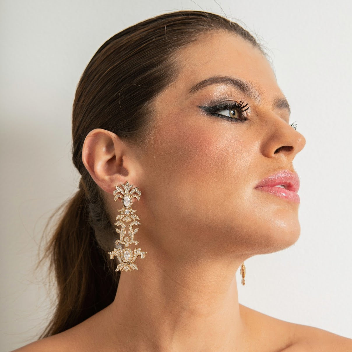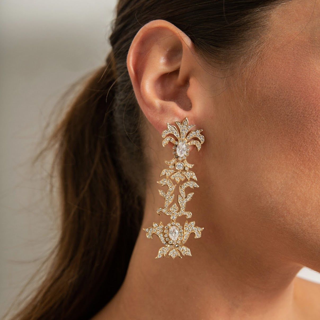 Brinco arabesco feito à mão em prata 950, cravado com pavê de pedras incolores e banho de ouro amarelo.