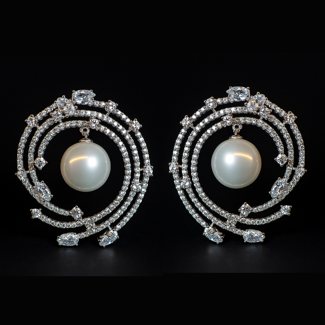 Brinco em metal cravado com zircônias, pérolas com banho de ródio.