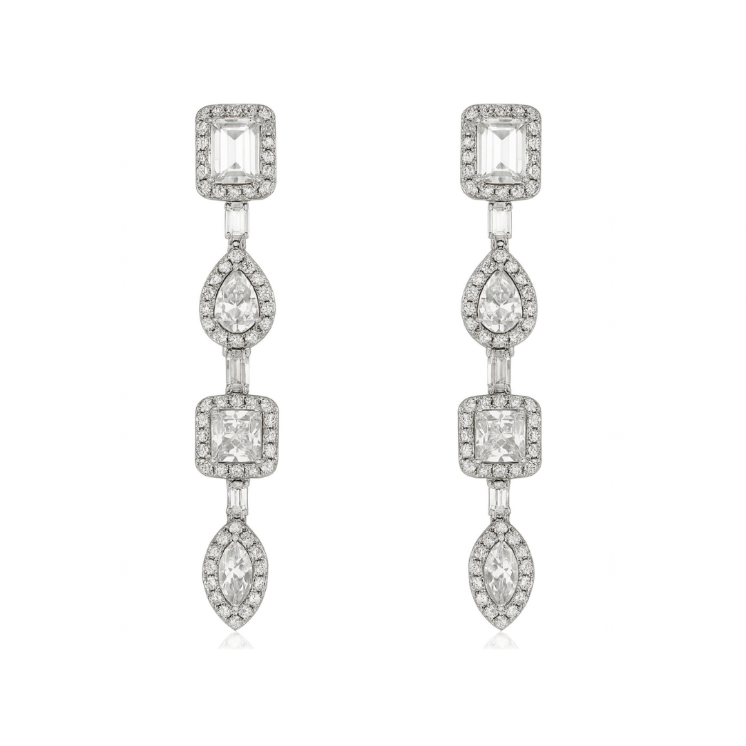 Brinco em prata 925, cravado com zircônias retangular, gota, prince e navete com moldura e acabamento em banho de ródio.