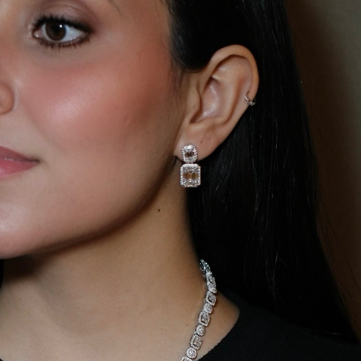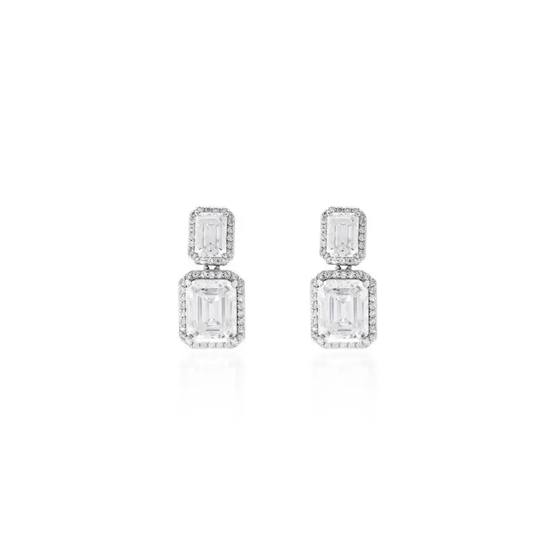 Brinco em prata 925, cravado com baguetes de 5 e 8mm e moldura de moissanita com banho de ródio.