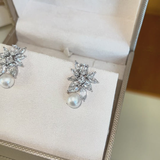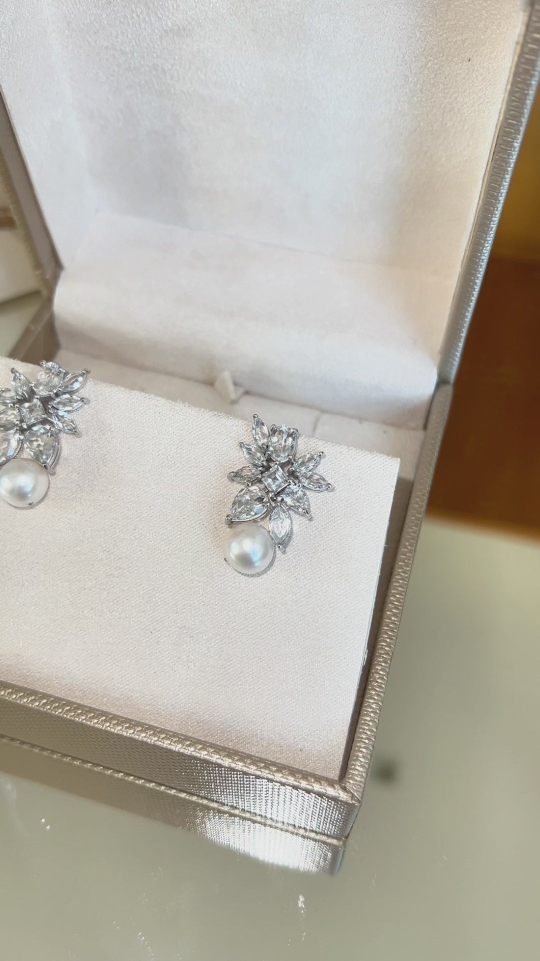 Brinco feito à mão em prata 950, cravado com 20,20ct de topázio incolores natural, pérola natural 10mm e acabamento em banho de ródio.