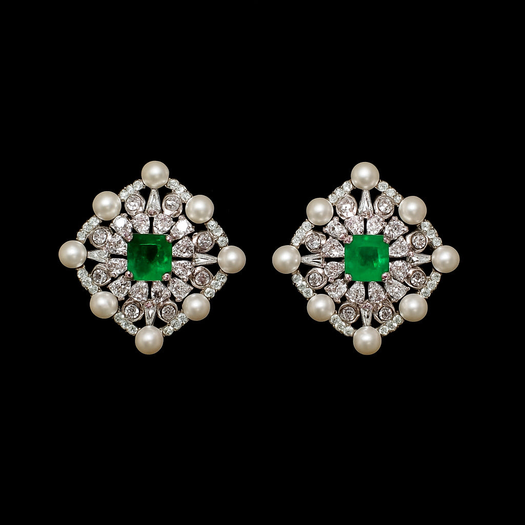 Brinco em metal cravado com esmeraldas fusion, zircônias redondas, e pérolas shell com banho de ródio.
