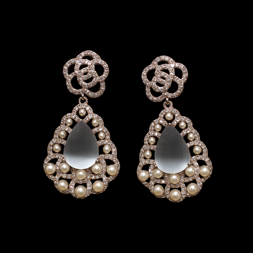 Brinco em metal cravado com calcedônias gotas fusion, zircônias, e pérolas com banho de ródio.