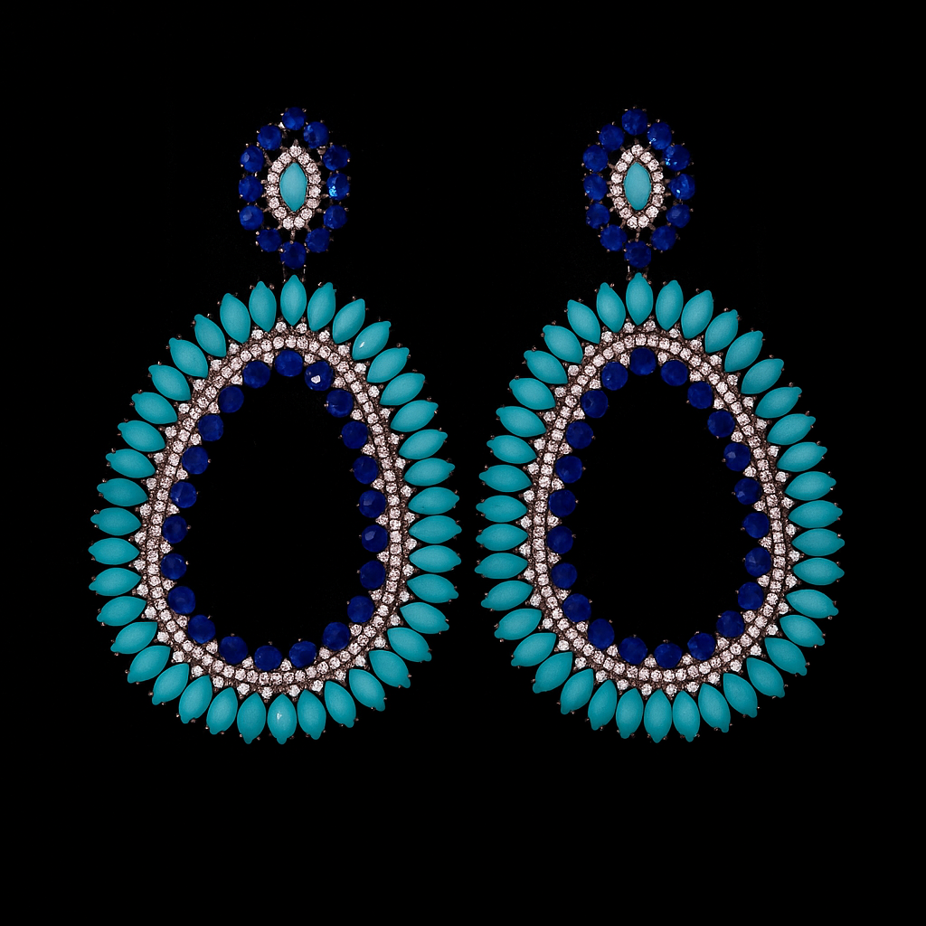 Brinco em metal cravado com zircônias, turquesas e safiras fusion com banho de ródio negro.