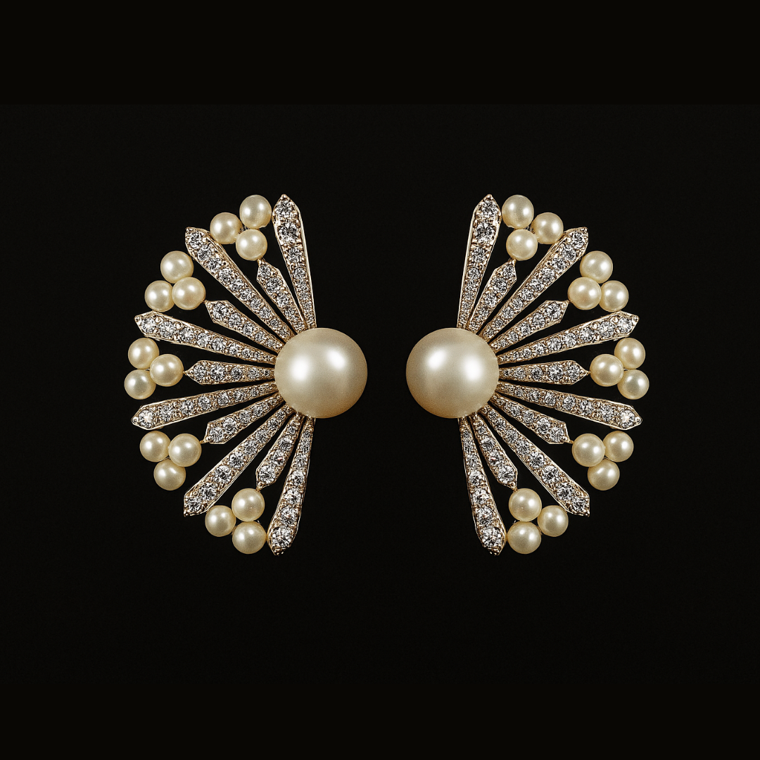 Brinco Leque com Zircônias e Pérolas com Banho de Ródio.