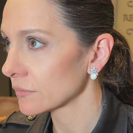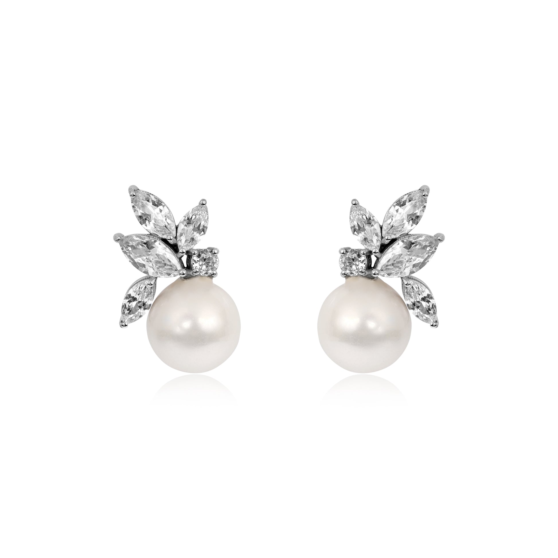 Brinco em prata 950 feito à mão, cravado com navetes e redondas, pérolas shell e acabamento com banho de ródio ou banho de ouro amarelo.