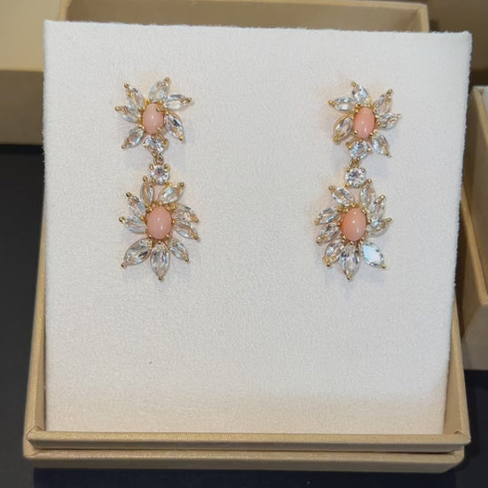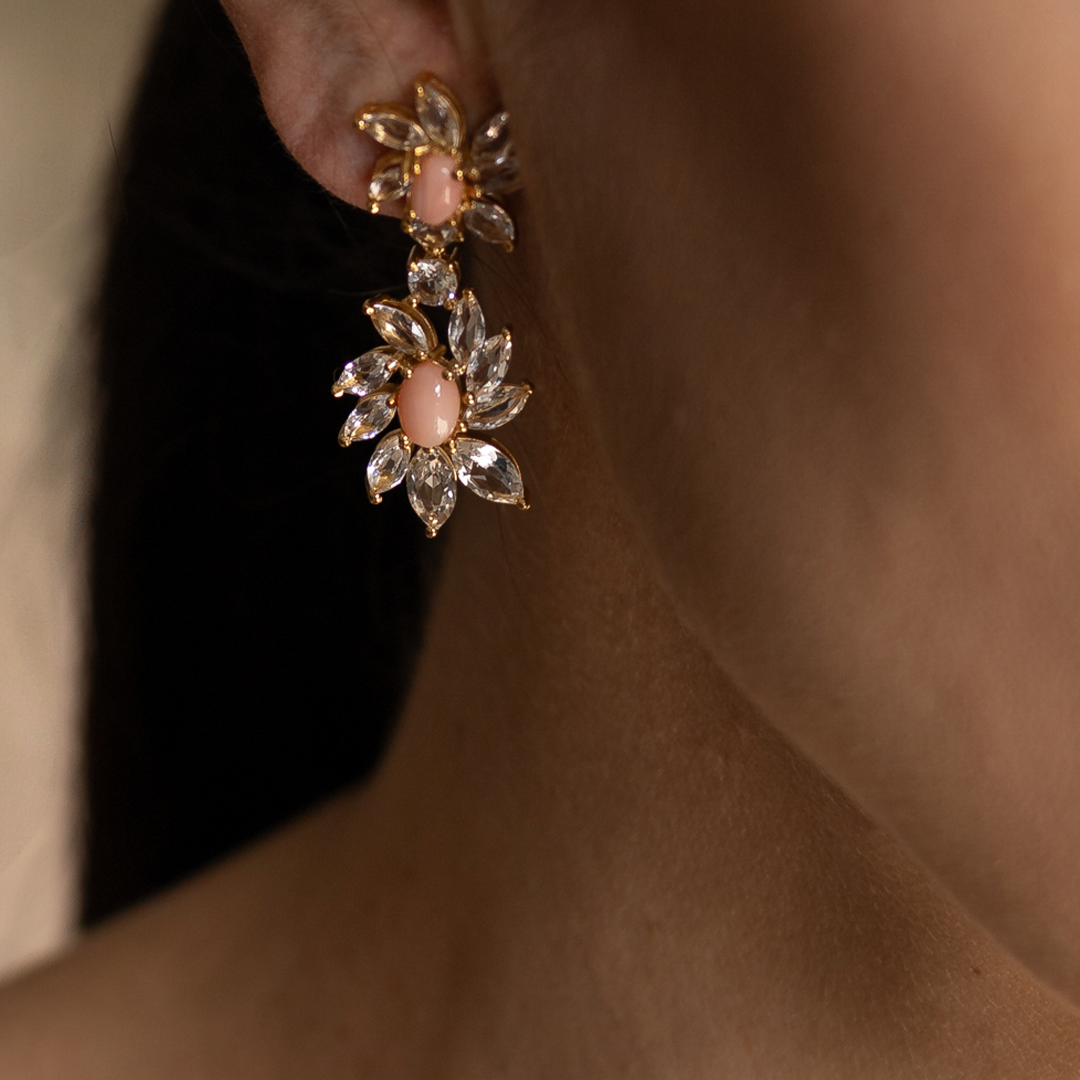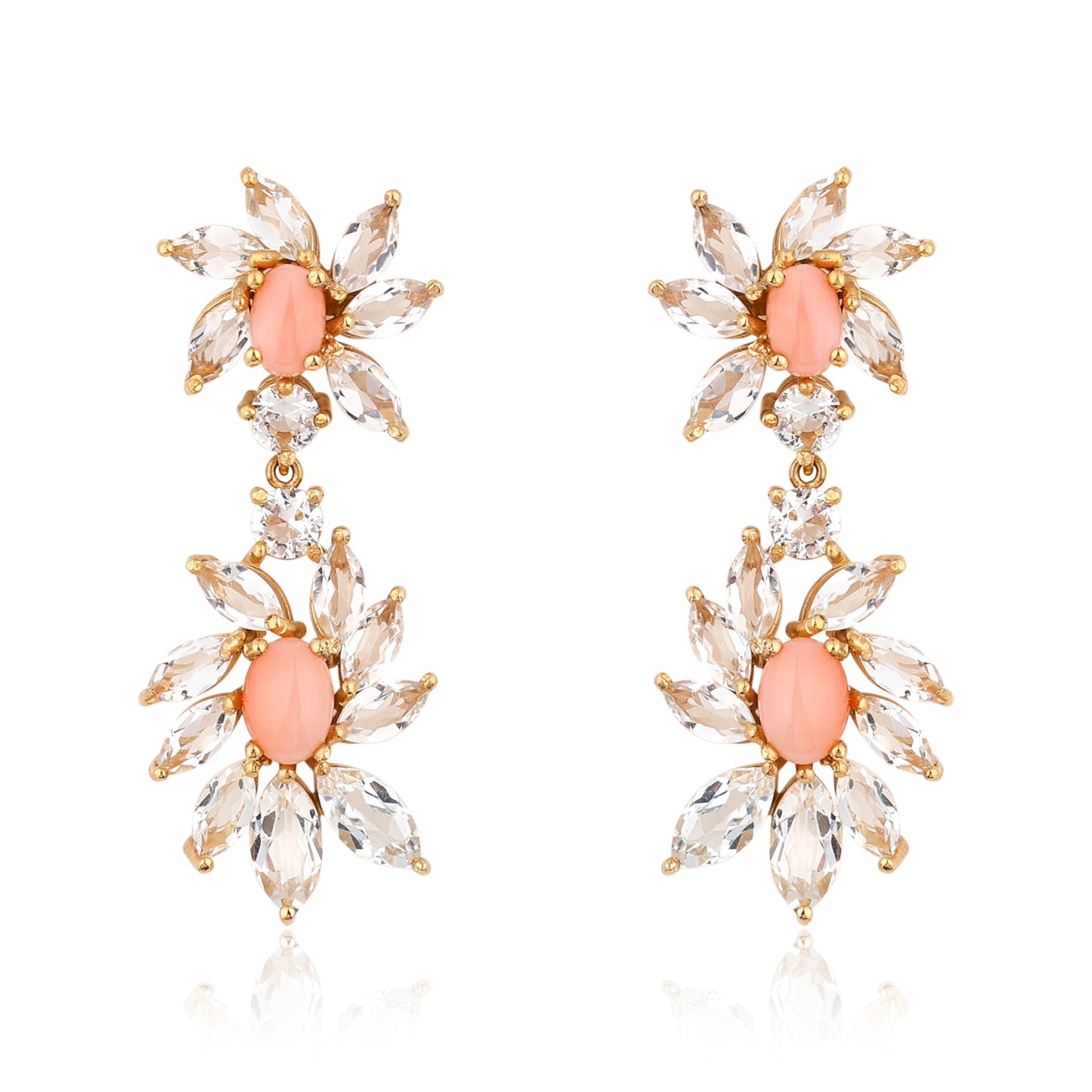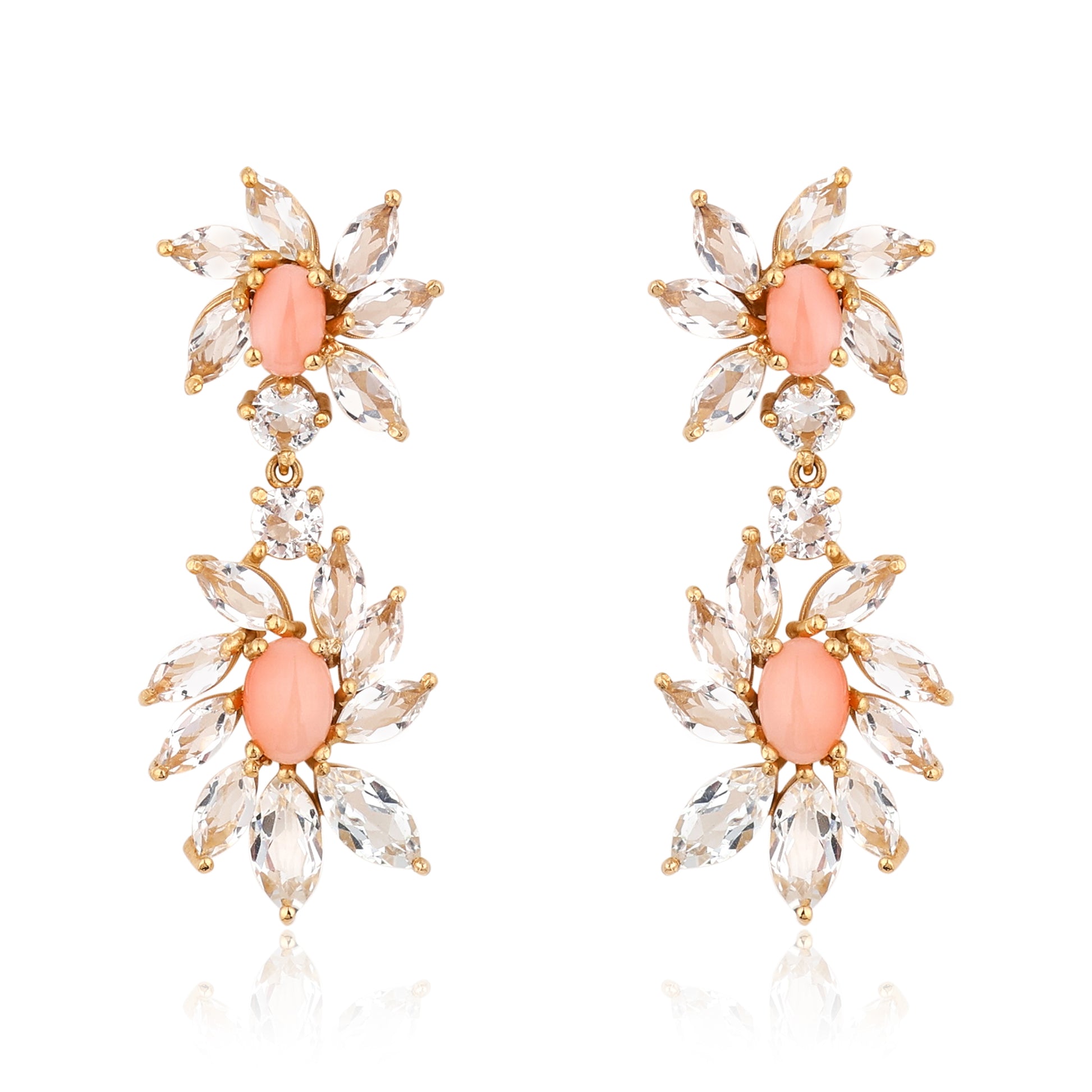 Brinco feito à mão em Prata 950, com topázio incolor e Coral cabochon com acabamento em banho de ouro amarelo ou ródio.