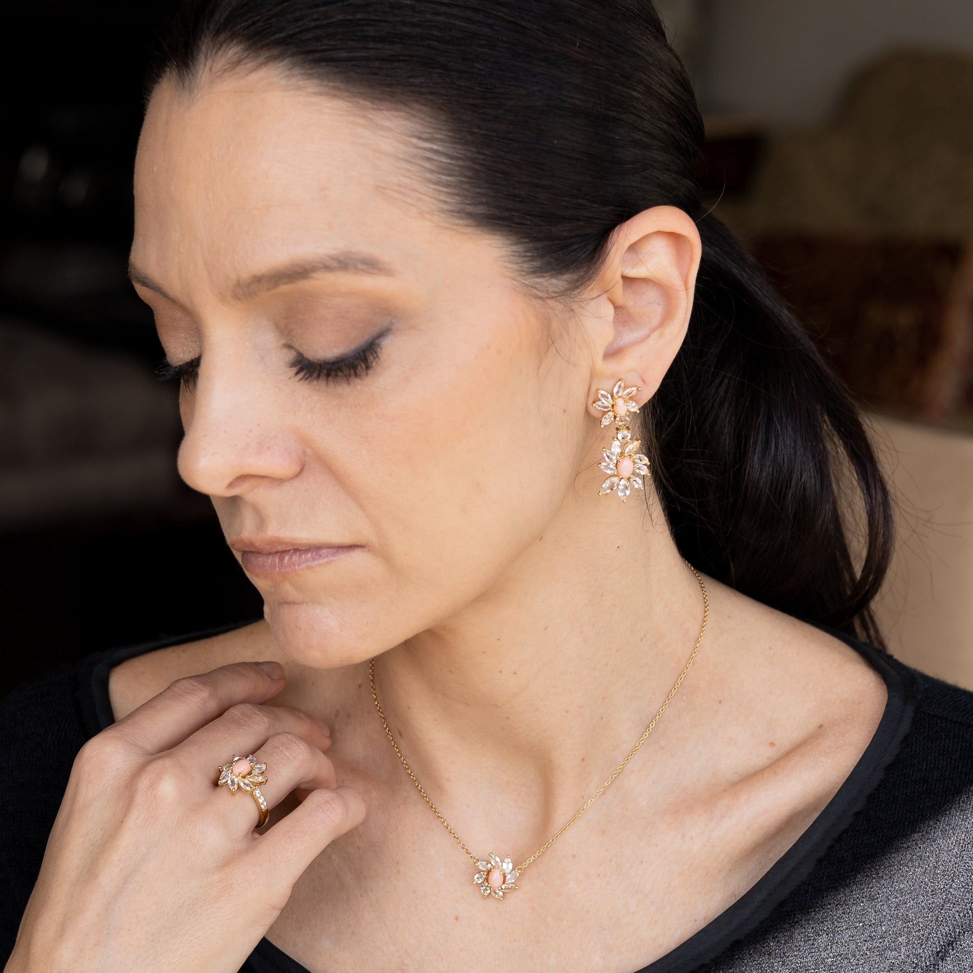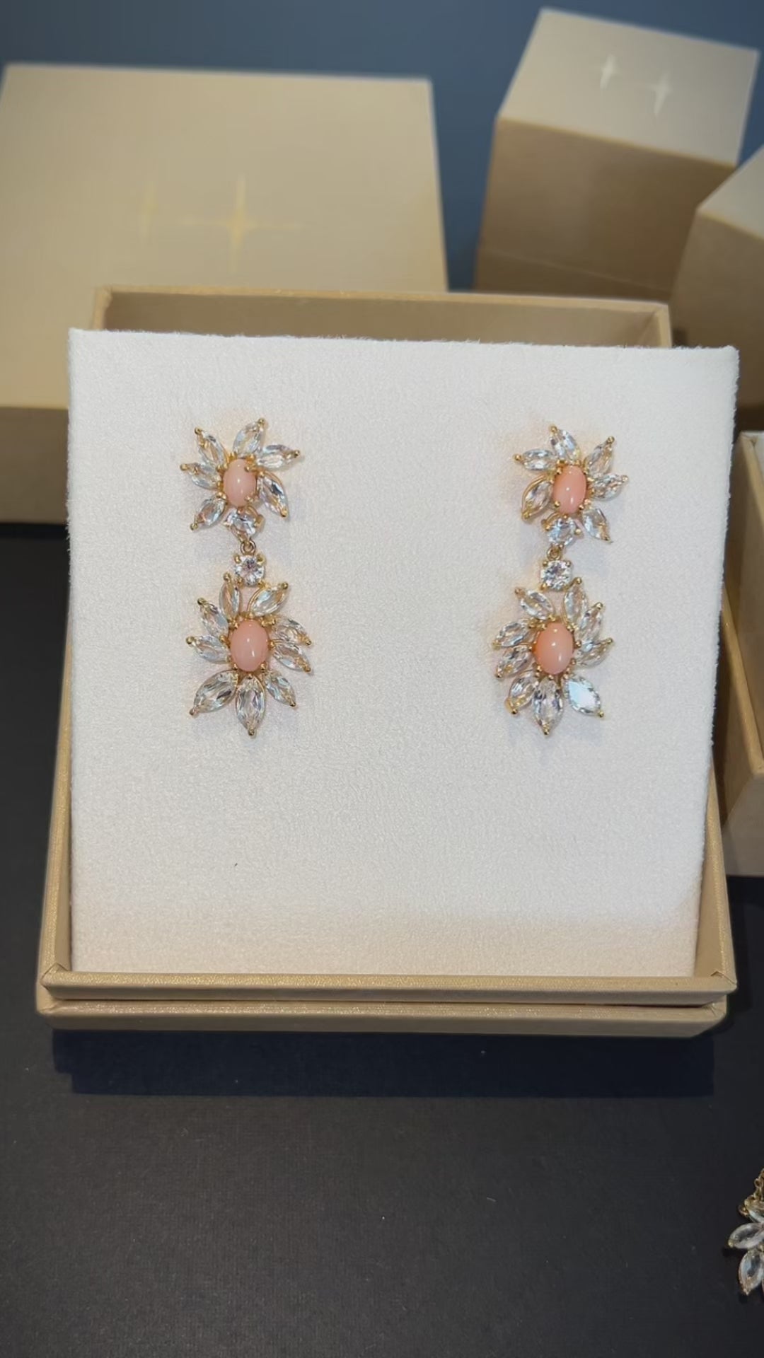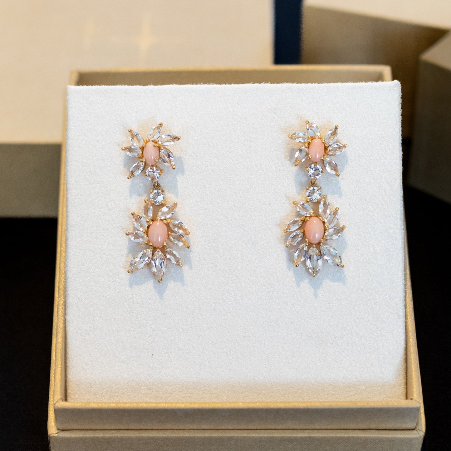 Brinco feito à mão em Prata 950, com topázio incolor e Coral cabochon com acabamento em banho de ouro amarelo ou ródio.