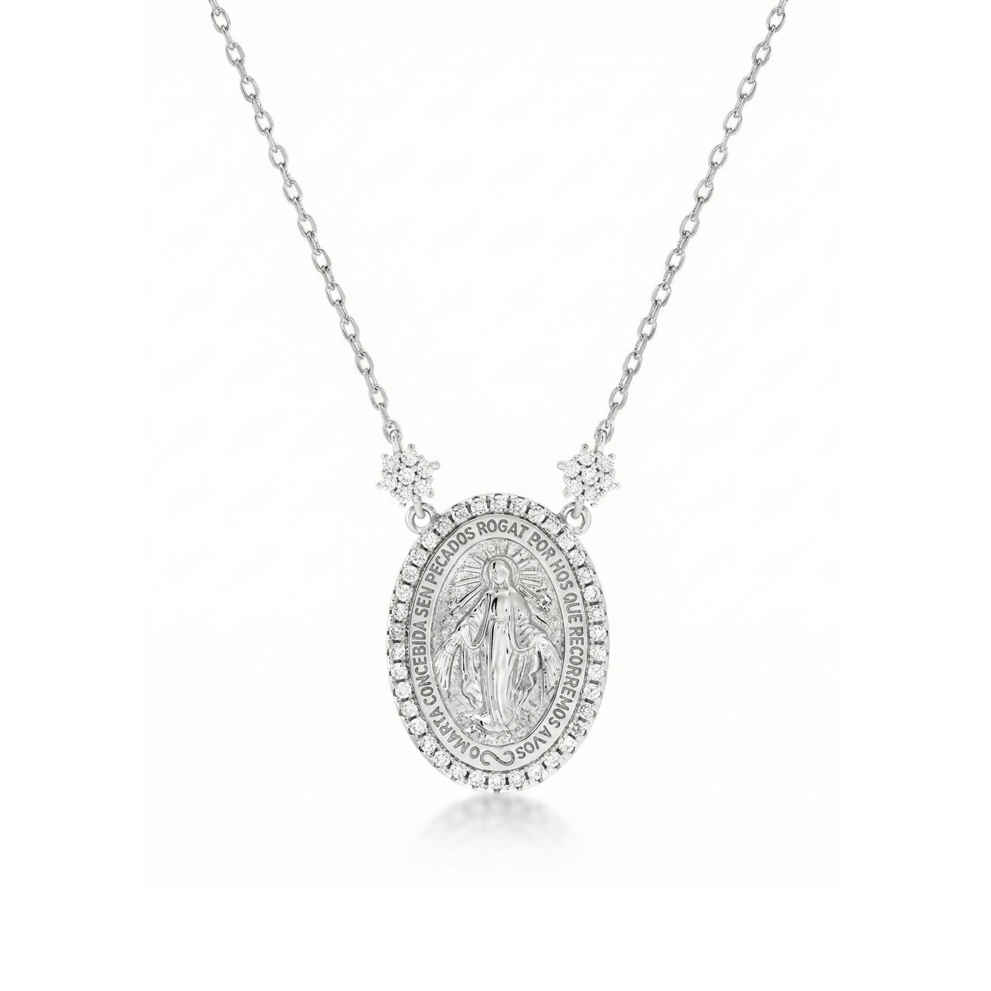 Colar em prata 925, medalha Nossa Senhora cravada com 0,26ct moissanitas em volta com corrente elo português e acabamento em banho de ródio.