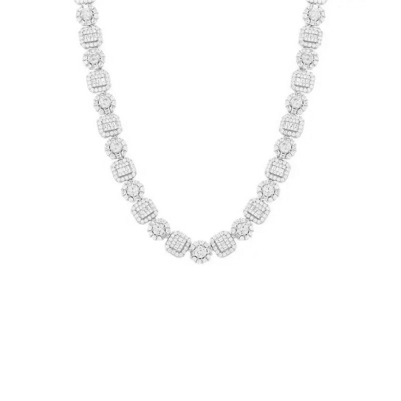 Colar em prata 925, cravado com zircônia redondas e baguetes com moldura e banho de ródio.