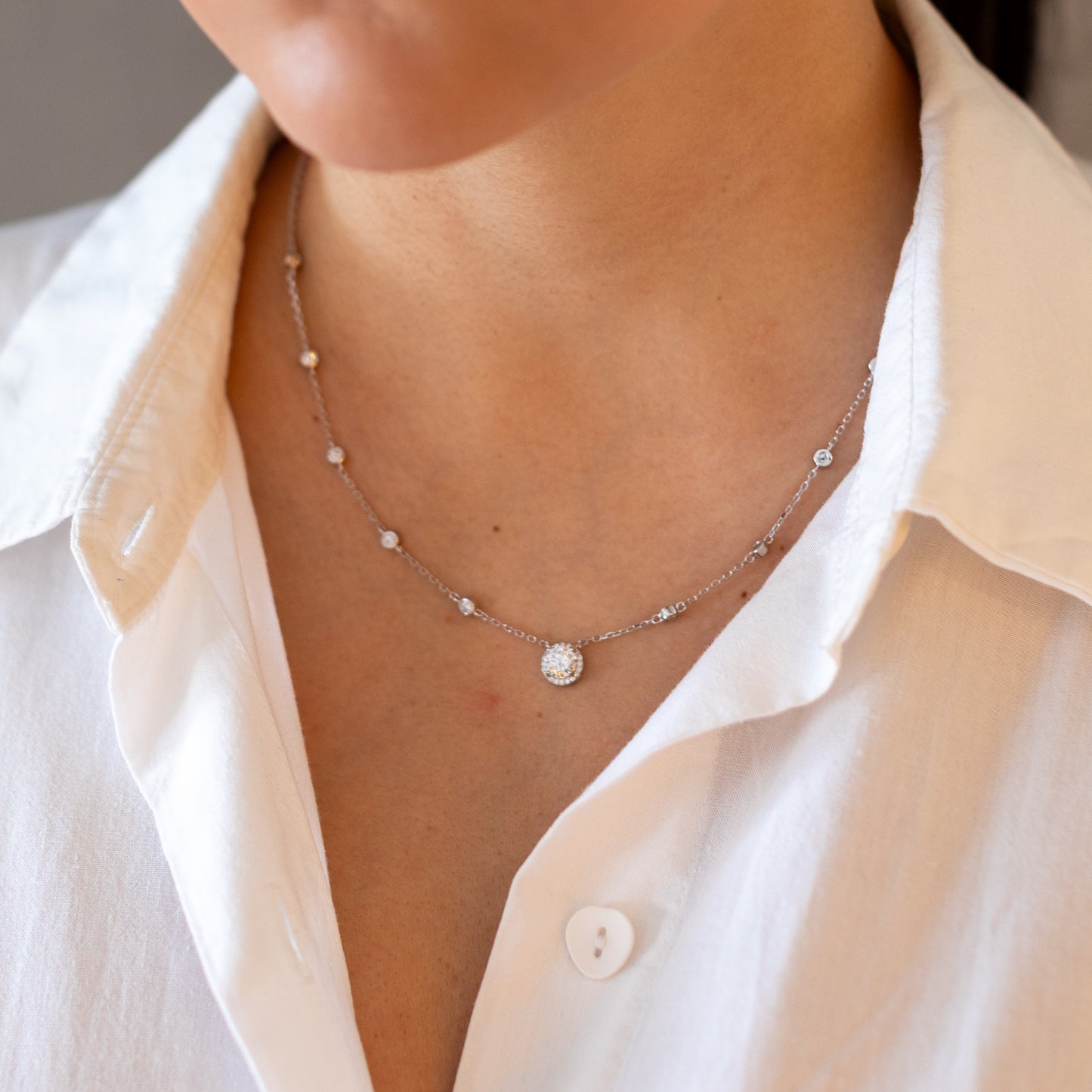 Colar em prata 925, central redonda de 6mm e moldura moissanita e pedras na corrente elo português e banho de ródio.