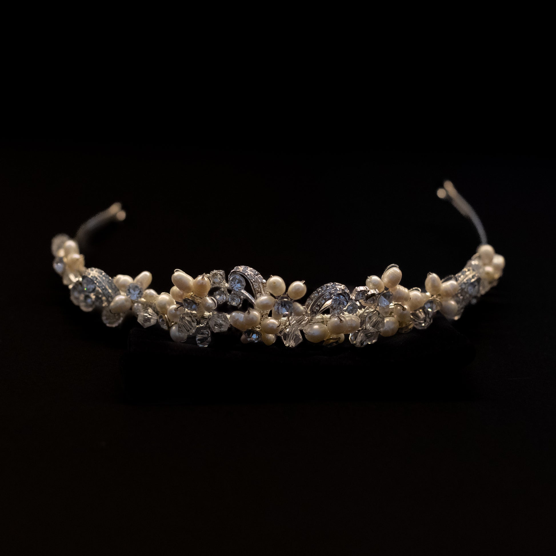 Coroa inglesa feita em metal, com cristais e pérolas.