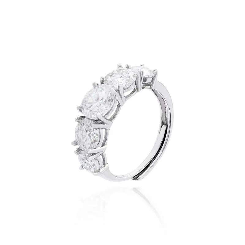 Meia Aliança em prata 925, cravado com moissanitas redondas e acabamento em banho de ródio.