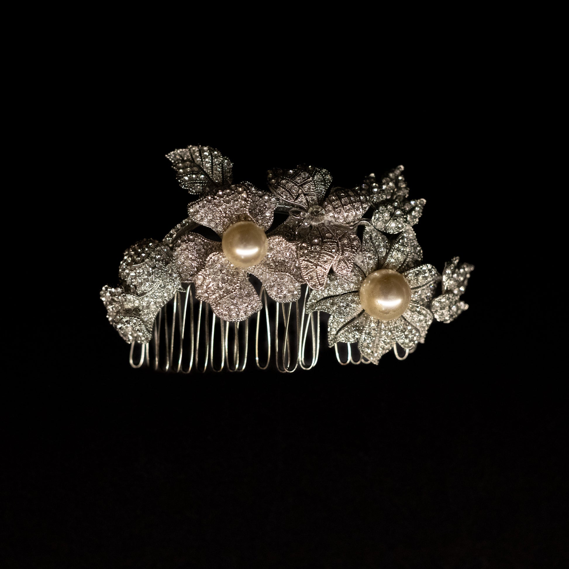 Pente estilo vintage australiano feito em metal, cristais e pérolas shell.