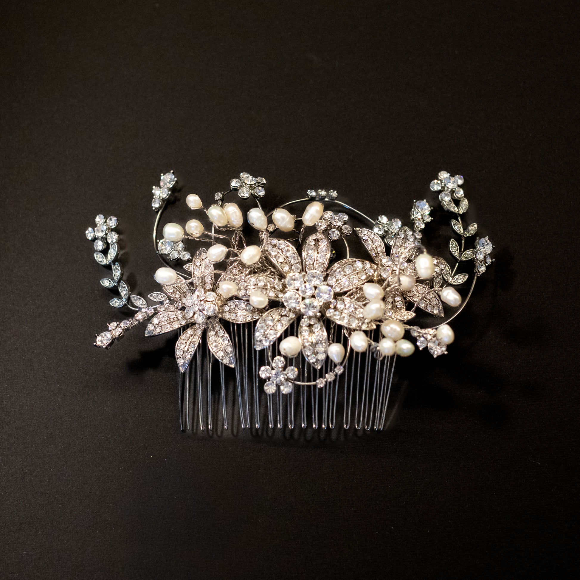 Pente Inglês feito a mão em metal, com cristais e conchas de pérolas.