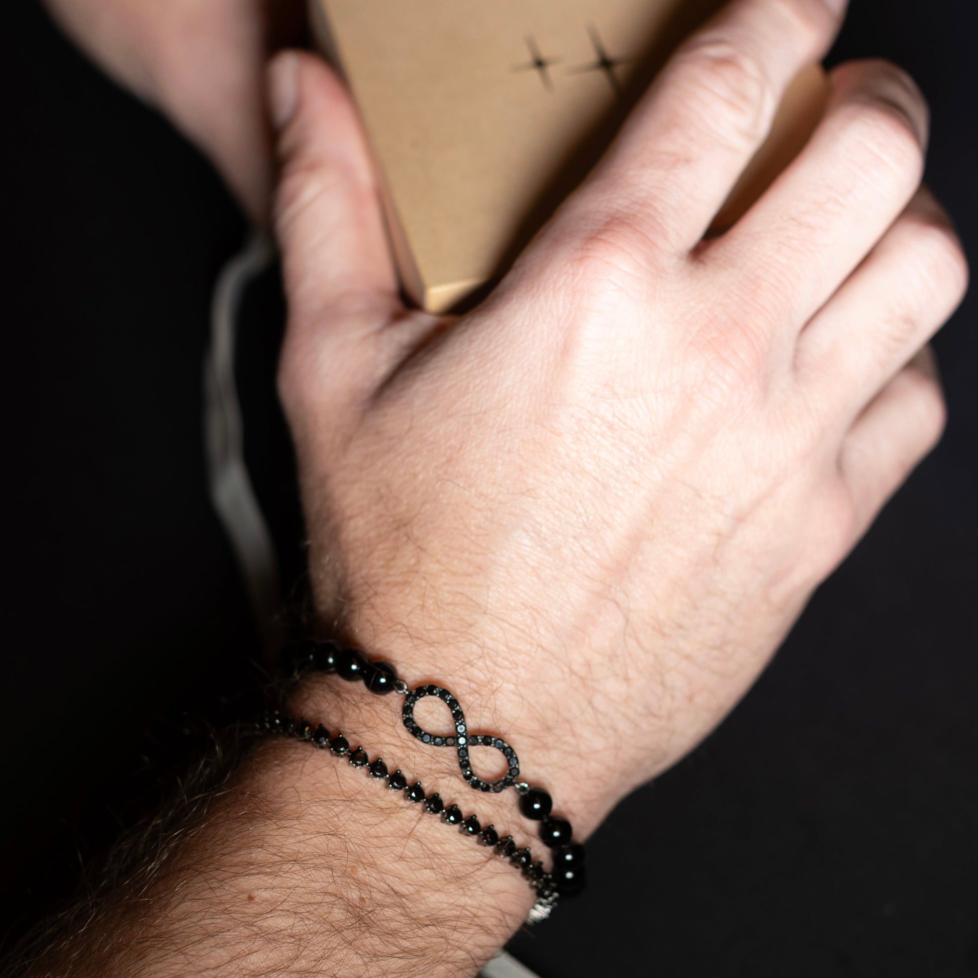 Pulseira feito à mão em prata 950, cravado com zircônias negras, esferas de ônix e banho de ródio negro.