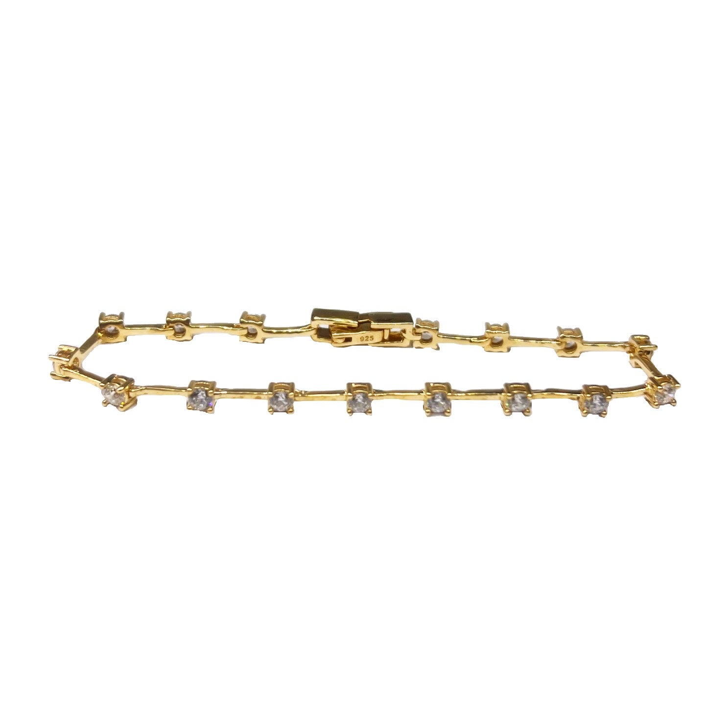 Pulseira riviera com fio faca em prata 925, cravado com zircônias 3mm redondas 4 garras e acabamento em banho de ouro amarelo.