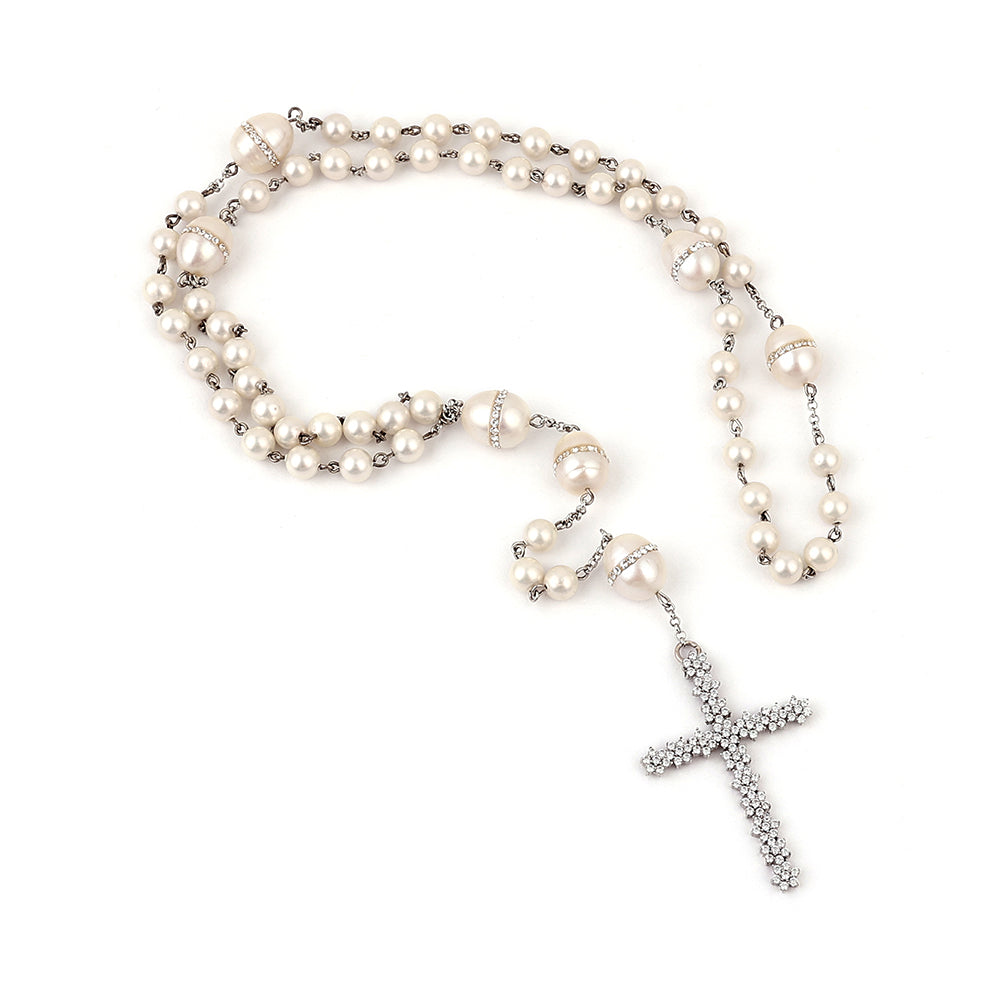 Colar terço feito em prata 950 cravado com zircônias, fio de pérolas shell e natural e banho de ródio.
