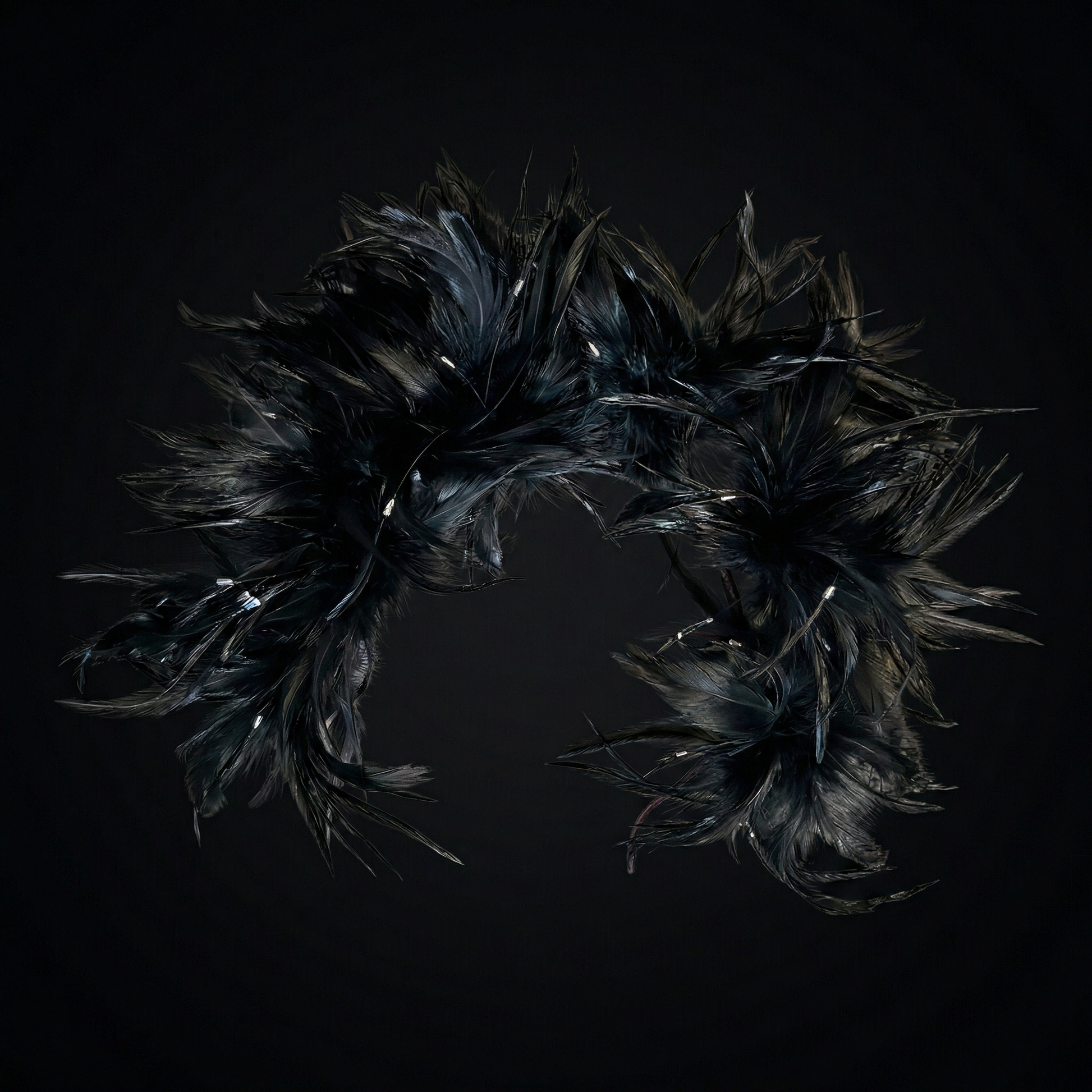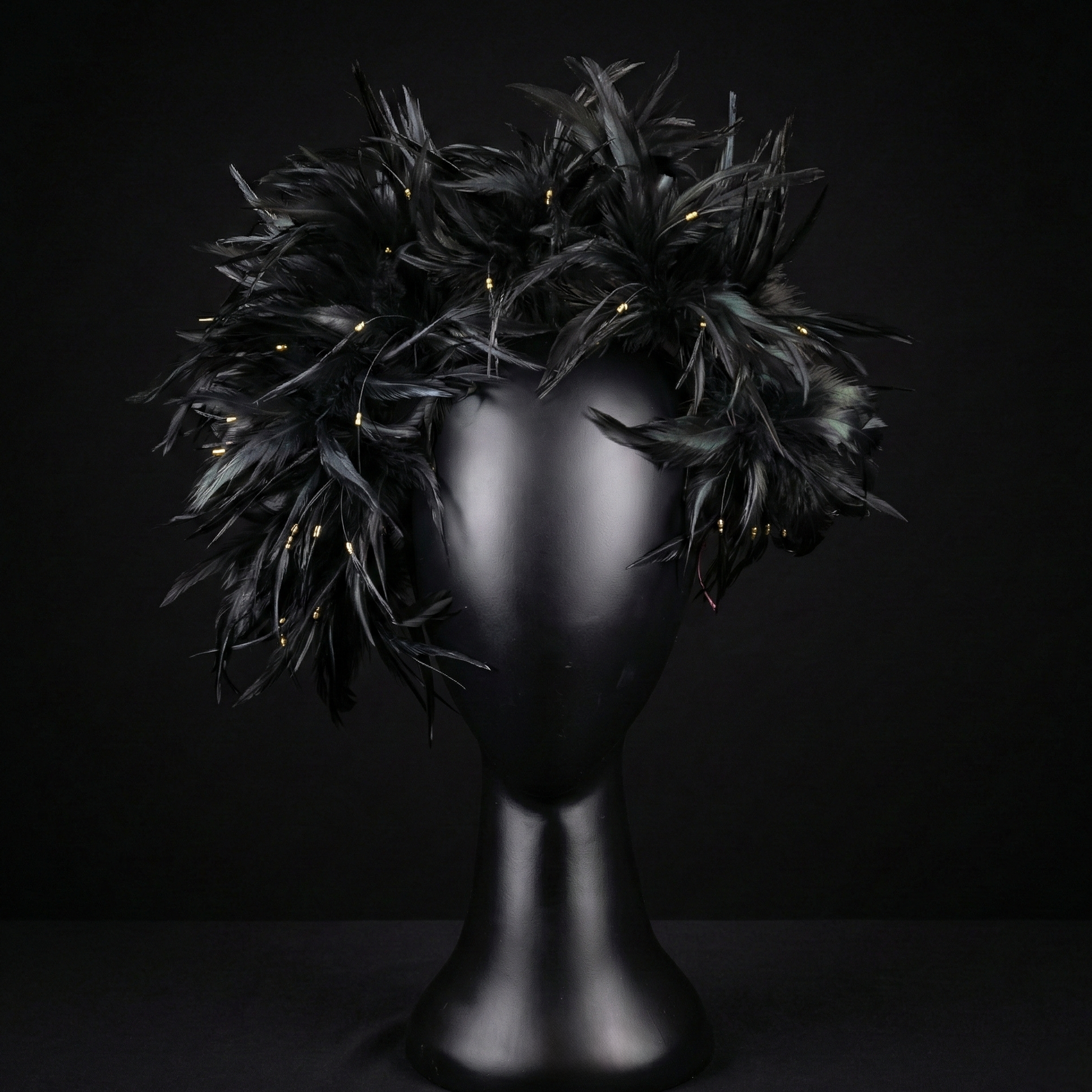 Tiara feita em plumas e com pingentes em acabamento de banho de ouro amarelo.