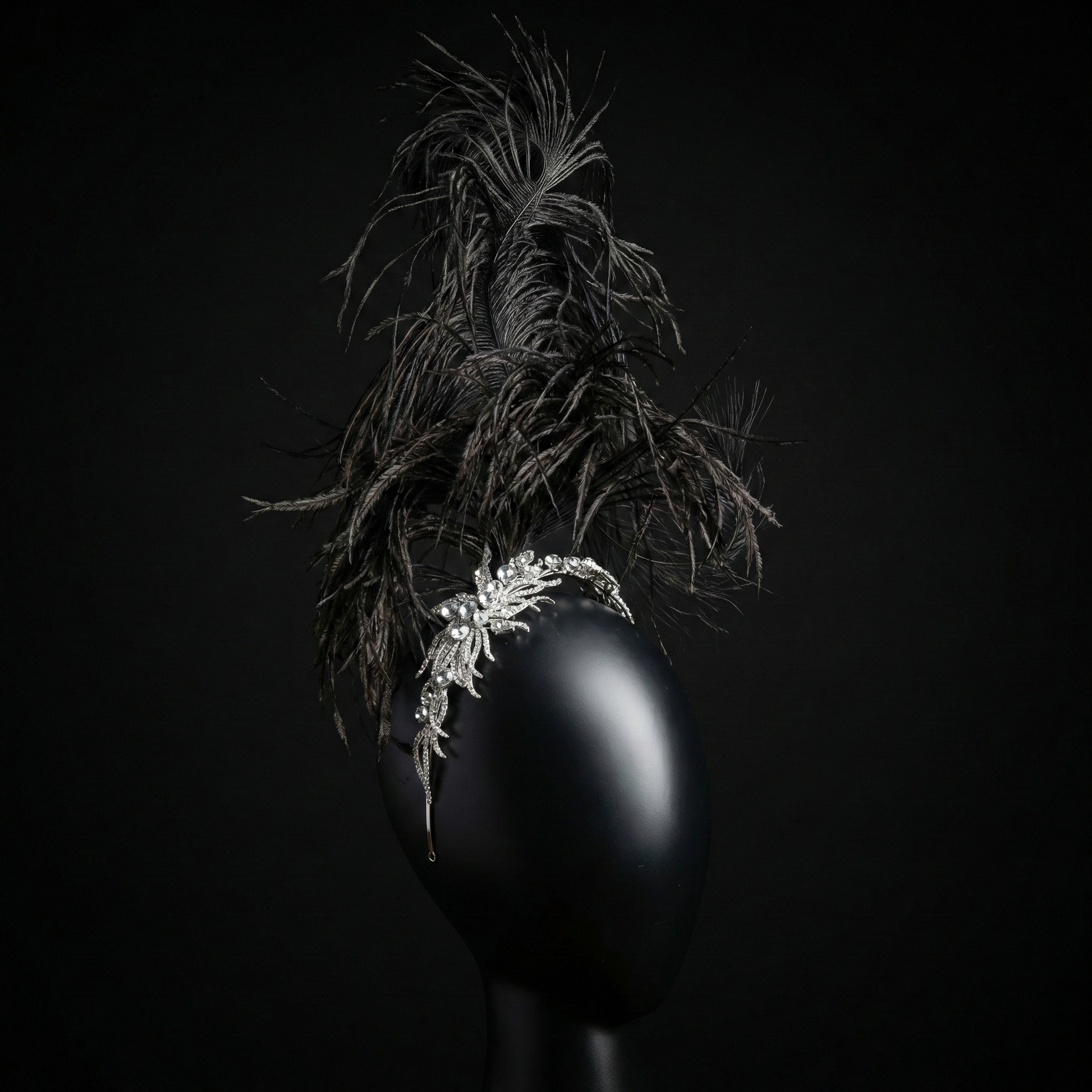 Tiara inglesa feito em metal, com cristais, pérolas e plumas.